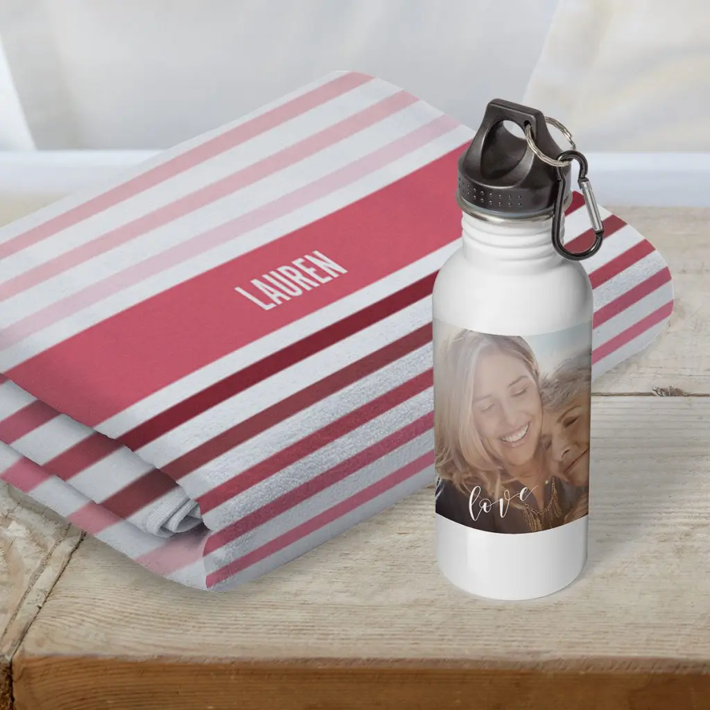 Que votre mère vive pour la salle de sport ou aime simplement faire du jogging dans le parc, elle appréciera d'avoir une serviette pour essuyer la transpiration. De plus, si vous personnalisez la serviette avec sa photo + son nom, elle risque moins de la perdre de vue.Pour les guerriers de l'entraînement qui ont besoin de rester hydratés, essayez de personnaliser l'une de nos bouteilles d'eau ! Notre bouteille d'eau isolée est parfaite pour garder l'eau agréable et froide pendant que maman transpire. Si maman fait beaucoup de randonnées, elle appréciera notre bouteille d'eau en acier inoxydable qui est livrée avec un mousqueton qu'elle peut attacher à son sac à dos ou à sa boucle de ceinture.