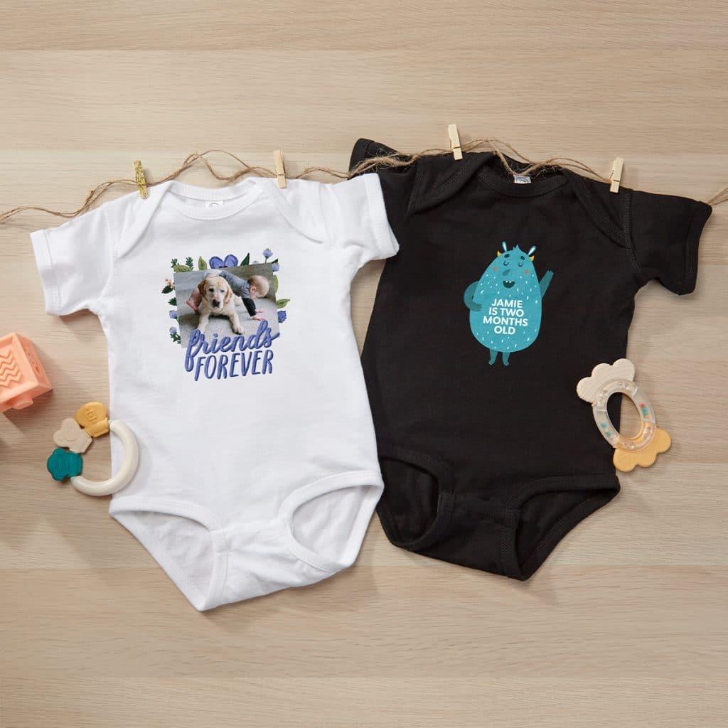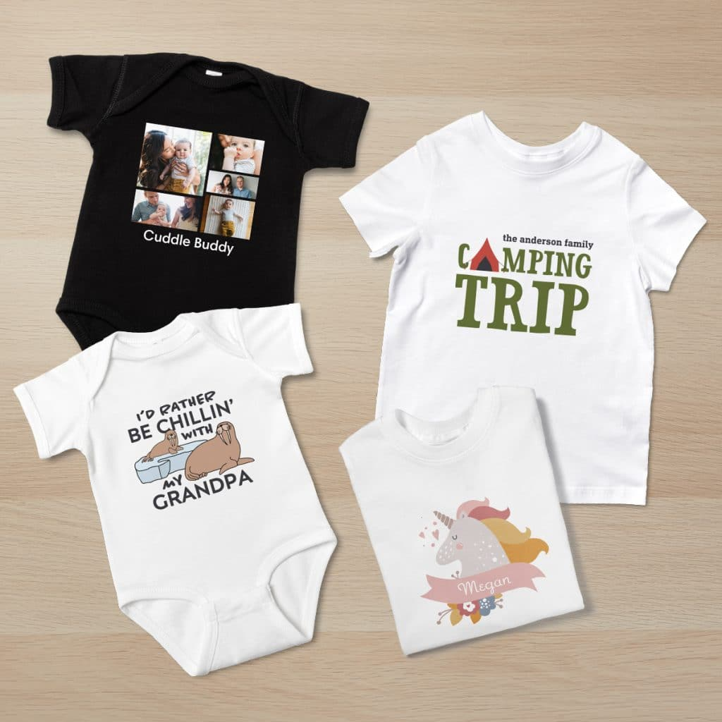 Il existe une infinité de combinaisons lors de la conception de votre body ou de votre t-shirt. Vous pouvez choisir l'un de nos modèles pour commencer ou plonger directement avec vos propres photos et textes. Organisez une fête d'anniversaire au-delà des attentes avec un design unique qui correspond le mieux au thème, ou capturez leur éclat immuable avec une barboteuse licorne magique.