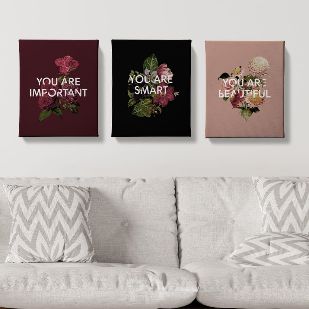 Certains jours, il est difficile de rester motivé. C'est pourquoi il est important de s'entourer de messages d'espoir et d'encouragement. Essayez de la réconforter en lui offrant une impression sur toile personnalisée avec une citation inspirante. Nous vous recommandons notre trio de toiles florales qui dit : "Tu es intelligente, tu es belle et tu es importante". Si ce look vous plaît, essayez aussi le motif You Are Beautiful sur nos t-shirts et tasses à café personnalisés.