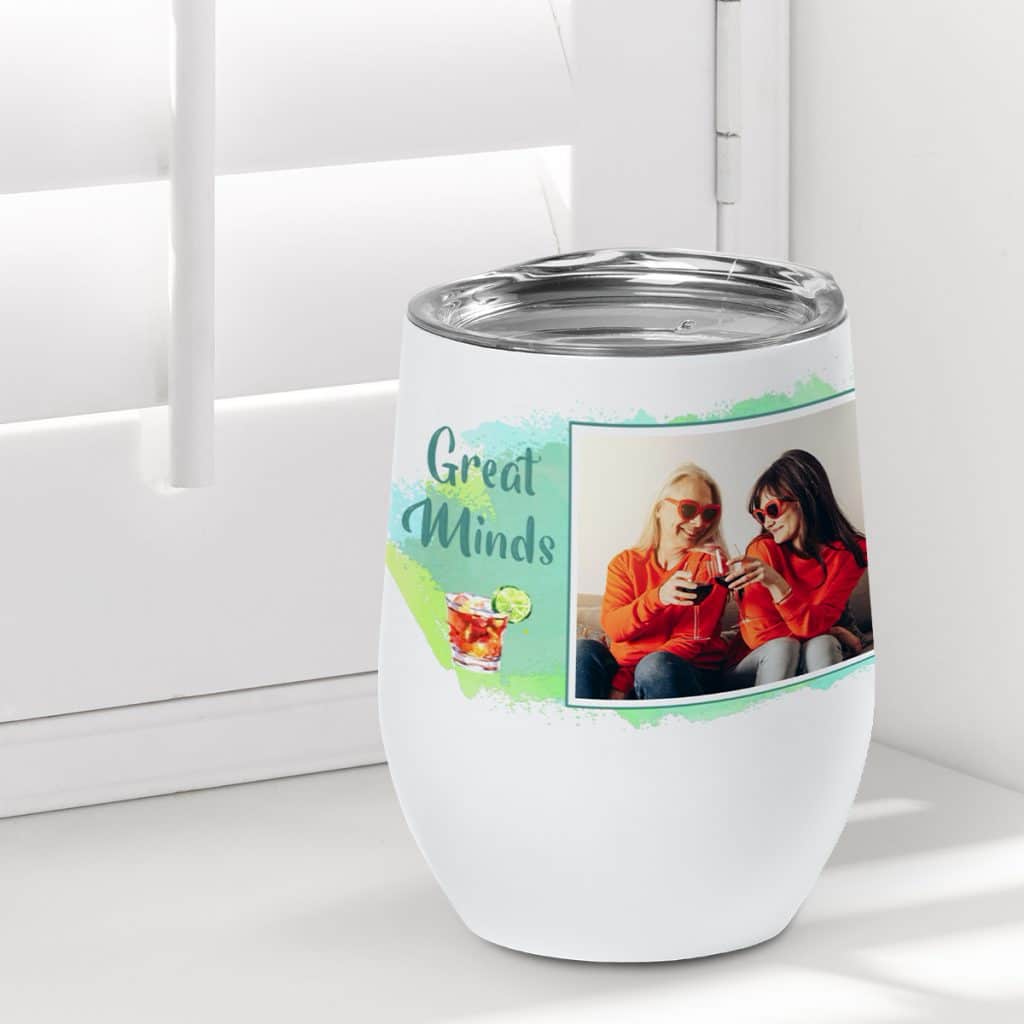 Santé aux copines qui sont toujours là pour prêter une oreille attentive et donner de bons conseils. Pour votre prochain rendez-vous, assurez-vous d'avoir des tasses assorties pour boire. Nous recommandons vivement notre insulated wine cup pour être sûr de garder ces boissons bien froides jusqu'au bout de la nuit. Quelques-uns de nos modèles préférés incluent des messages comme, “Why limit happy to an hour?” et “Great minds drinks alike”.