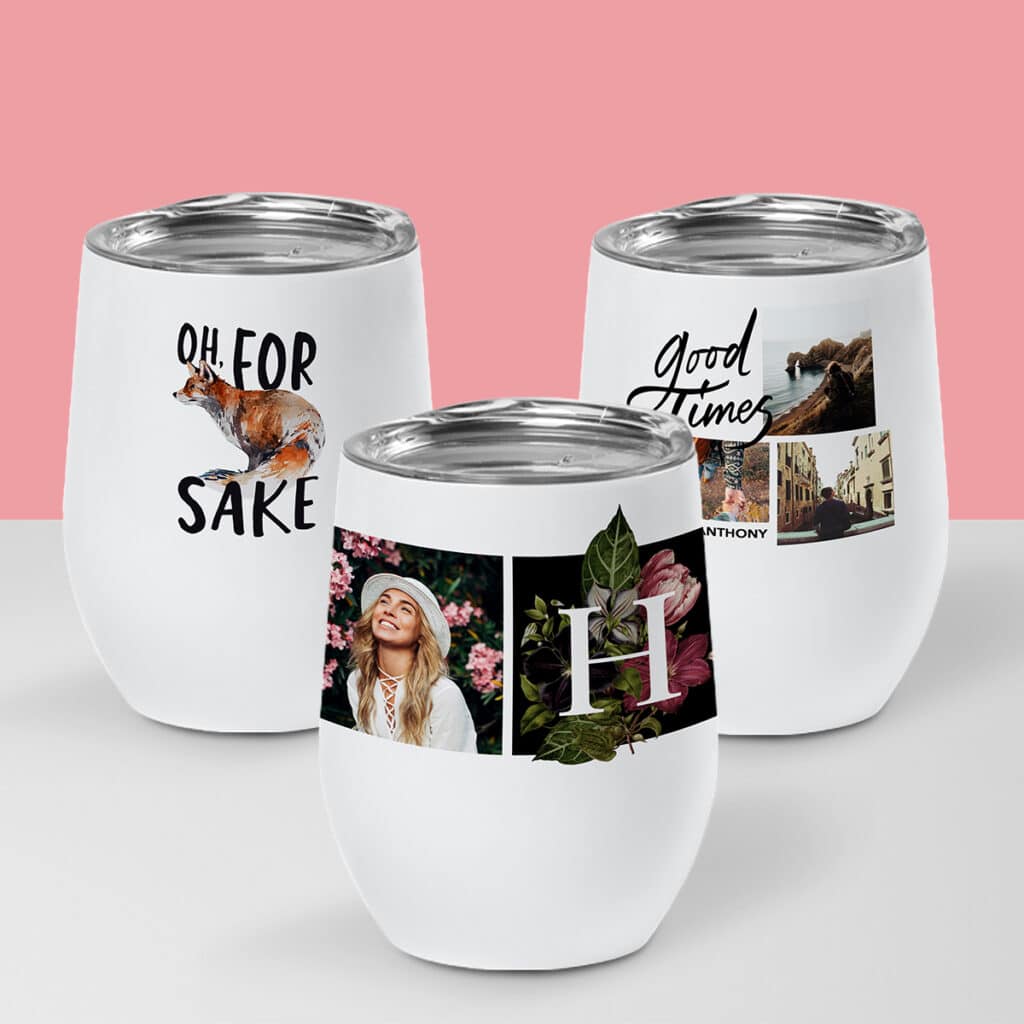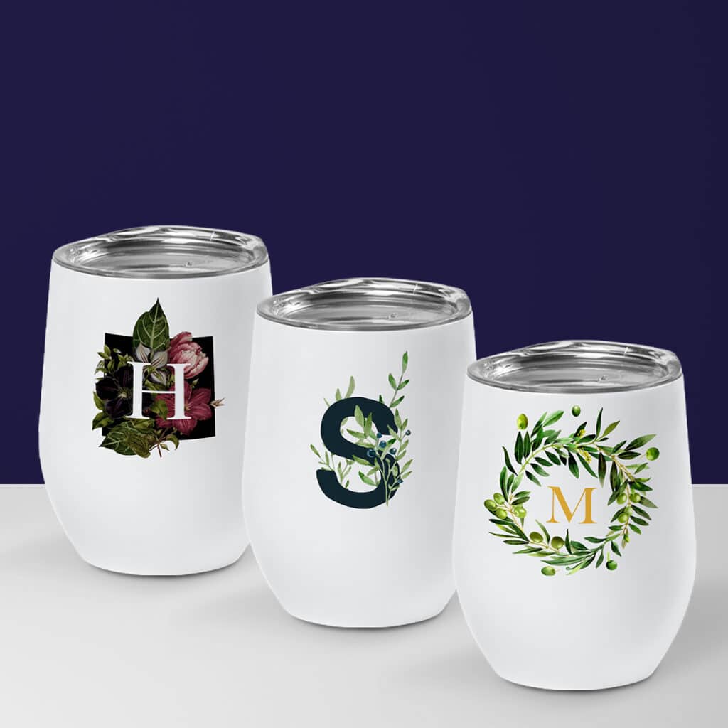 Le monogramme moderne est un autre bel ajout à nos conceptions de tasses à vin sans pied. Nous adorons la palette de couleurs douces et les motifs en arc, et les deux sont tellement à la mode en ce moment. Encore une fois, nous avons beaucoup d'espace pour vos souvenirs photo préférés ici aussi ! Celui-ci ferait un excellent cadeau pour une amie ou une autre personne significative.