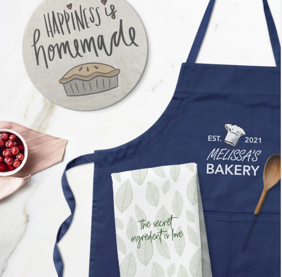 N'oubliez pas d'ajouter des embellissements à votre design pour vraiment pimenter les choses ! Si vous ne savez pas où les trouver, choisissez simplement le produit que vous souhaitez personnaliser et ouvrez-le dans notre générateur de projets. Une fois là-bas, cliquez sur l'onglet « Embellissements » et choisissez Nourriture et cuisine pour trouver des ustensiles de cuisine, des ustensiles de cuisine et des icônes de nourriture. Vous pouvez également rechercher tous les embellissements en utilisant la nouvelle barre de recherche en haut de l'onglet.