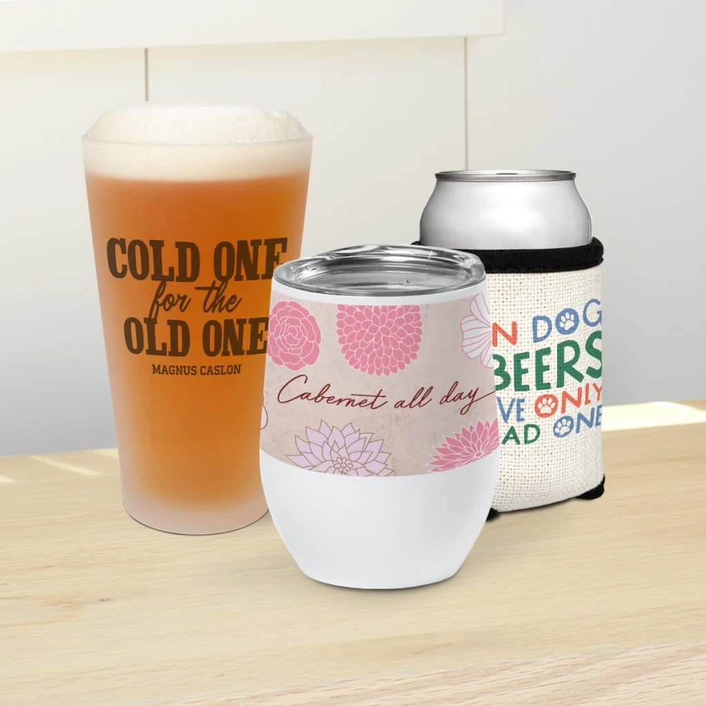 Nous avons récemment ajouté de nouveaux produits amusants à notre collection d'articles pour boissons : des verres à pinte givrés et des refroidisseurs de canettes ! En ajoutant l'une de ces citations à votre barware, vous profitez non seulement d'une boisson fraîche, mais aussi d'une tranche d'esprit.