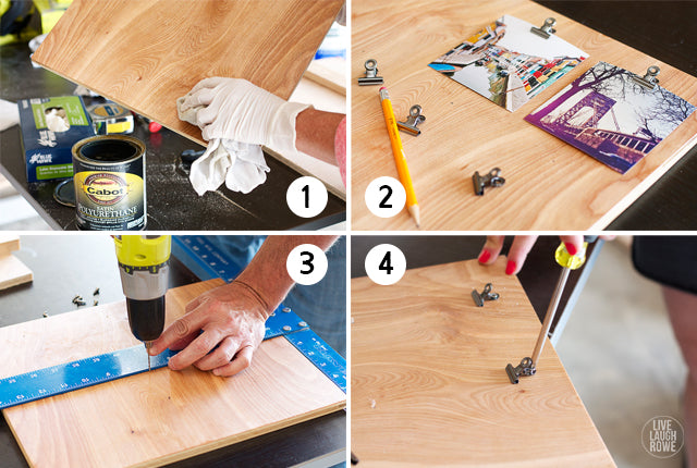 Étape 1 : Poly ou teindre la planche. Assurez-vous que la planche a été poncée sur les bords et de chaque côté, si nécessaire. Vous pourriez facilement tacher votre planche ; Cependant, j'ai décidé de garder le bois d'une couleur brute et naturelle et j'ai appliqué quelques couches de polyuréthane.Étape 2 : placement du clip. Décidez où vous allez placer vos photos et clips. J'ai décidé de placer le mien avec un tableau orienté horizontalement, avec trois images en travers sur deux rangées.