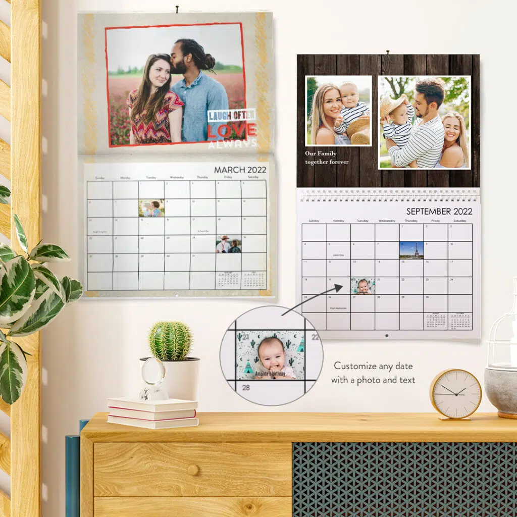 Créer un calendrier personnalisé en ligne est un jeu d'enfant. Tout ce que vous avez à faire est de choisir le style et la conception de votre calendrier, de télécharger des photos et d'ajouter des événements importants à nos mises en page de calendrier prédéfinies. Nous l'imprimerons et le livrerons directement à votre porte.