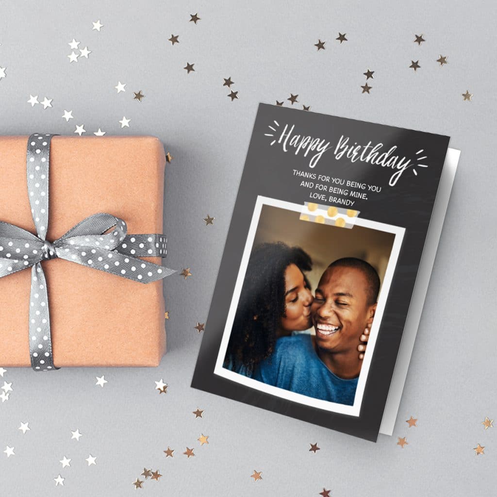 Nous vous avons montré beaucoup de cartes d'anniversaire typographiques et illustratives… Que diriez-vous d'une carte qui met en valeur les souvenirs photo préférés de vous et de votre ami ? Le design Chalk Birthday Burst est une option mignonne + classique ! L'effet de faux ruban washi sur les photos est si ludique + adorable, et nous aimons aussi la police de script blanche présentée. Choisissez parmi une disposition verticale avec une photo ou une disposition horizontale avec deux photos pour personnaliser la carte parfaite. Ajoutez également un message sur le devant dans la police de votre choix!