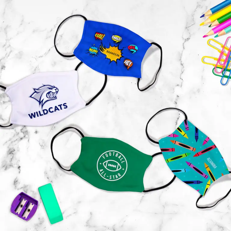 Des masques personnalisés sont également fabriqués avec des logos et des mascottes d'école pour des looks amusants pour la rentrée. Les enfants, les adolescents et même les plus jeunes adoreront montrer nos designs ludiques et colorés. Nous avons même vu les masques comme des cadeaux de fête indispensables pour les mariages et autres rassemblements intimes où le style socialement distant est un must. Il n'y a pas de limite à votre créativité !
