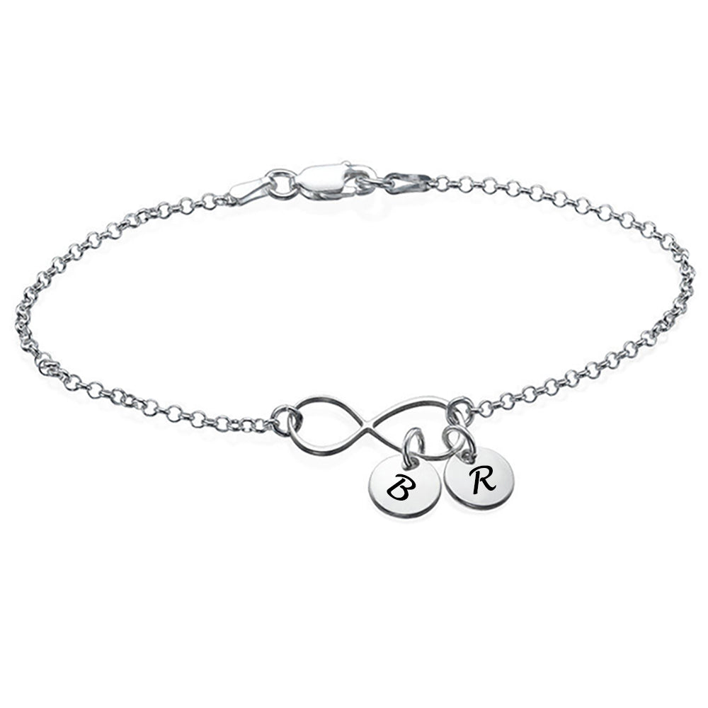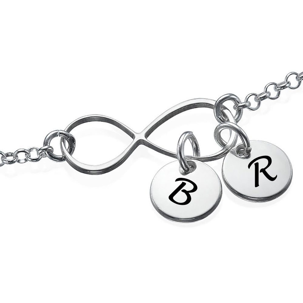 Bracelet de cheville Infini avec Breloques Initiales S0019 gravé personnalisé. Un beau classique, ce bijou est agrémenté du mot ou du prénom de votre choix dans une police cursive spéciale avec des accents courbes sur la première et la dernière lettre. Le pendentif à double jauge est suspendu à une chaîne d'ancre assortie avec une rallonge qui vous permet d'obtenir facilement l'ajustement idéal. Cet élégant bracelet est en argent sterling ou en cuivre.