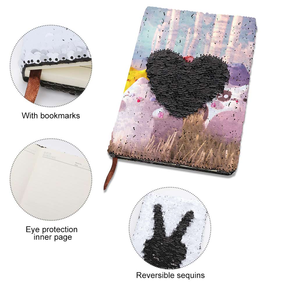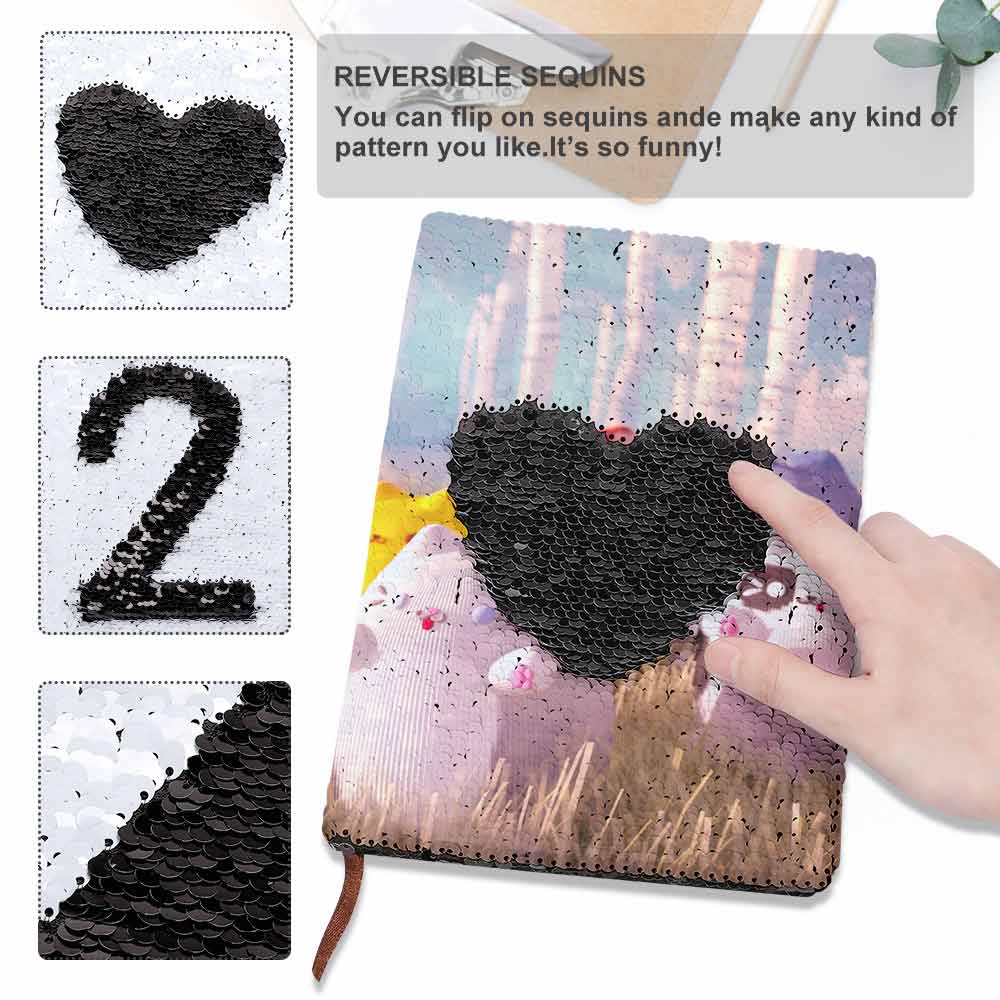 BG1613016 Cahier/Carnet à paillettes Journal impression personnalisé avec photo logo texte motif. Ce carnet à paillettes recto-verso peut ajouter des couleurs par lui-même, ce qui peut stimuler la créativité et créer différents motifs et textes. Le design élégant des paillettes n'affectera pas votre utilisation du cahier. La taille est très appropriée pour les sacs à main, les cartables, les sacs à dos. Le design joli du cahier à rabat convient à toutes les occasions. Ce cahier est un cadeau parfait pour les enfants comme le cadeau d'anniversaire, la récompense d'un examen.