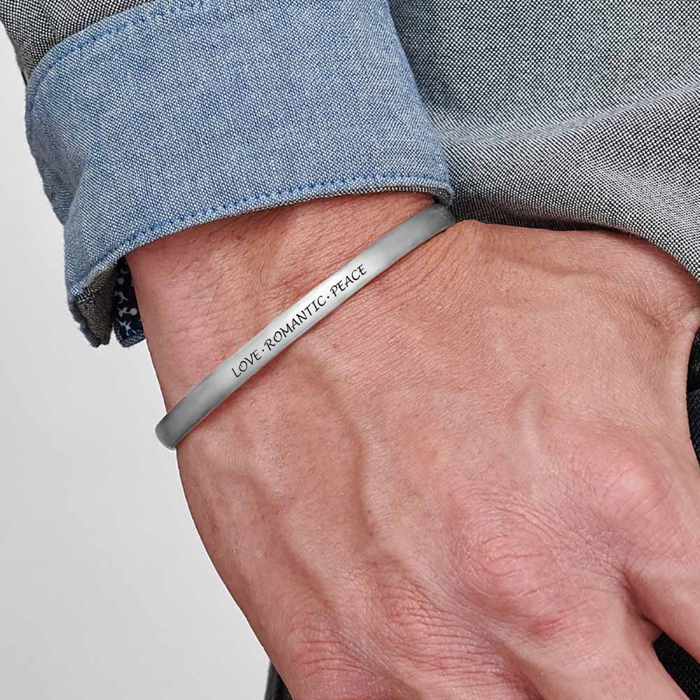 Bracelet Ouvert Simple en argent pour hommes S0046 gravé personnalisé avec texte prénom. Ce bracelet est un accessoire élégant avec un accent tendance de premier plan qu'il vous suffit de définir cette saison. Une torsion sur le bracelet d'identification classique, le cerceau vous donne un look expressif, symétrique mais féminin. Grâce à l'ouverture arrière, le cerceau peut être facilement enfilé et retiré à tout moment, que vous le portiez seul ou dans une pile polyvalente.