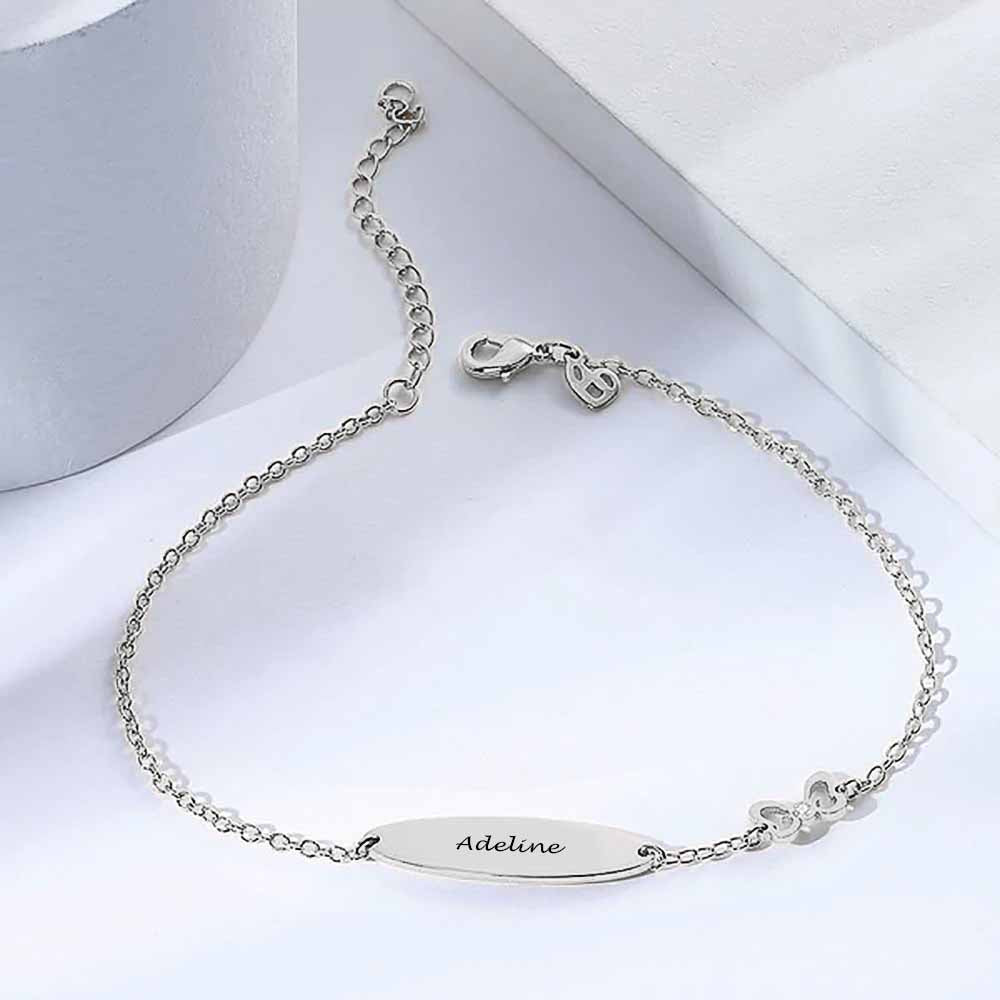 Bracelet de cheville à graver S0036 pour femme et homme gravure personnalisé avec un disque ovale avec prénom texte. Les bijoux gravés sont un cadeau qui ne manquera pas d'être apprécié - quelle que soit l'occasion ! Ce bracelet de cheville à graver avec un disque ovale gravé S0036 avec placage en or rose 18 carats en argent ou en cuivre est exactement ce qu'il faut pour quelqu'un de spécial et constitue également une pièce parfaite pour votre propre collection.La chaîne a un délicat disque ovale que vous pouvez graver avec le nom du porteur ou un autre mot significatif ; la pièce est en argent sterling ou en cuivre et se compose d'une chaîne d'ancre avec une extension pour que la chaîne s'adapte toujours.