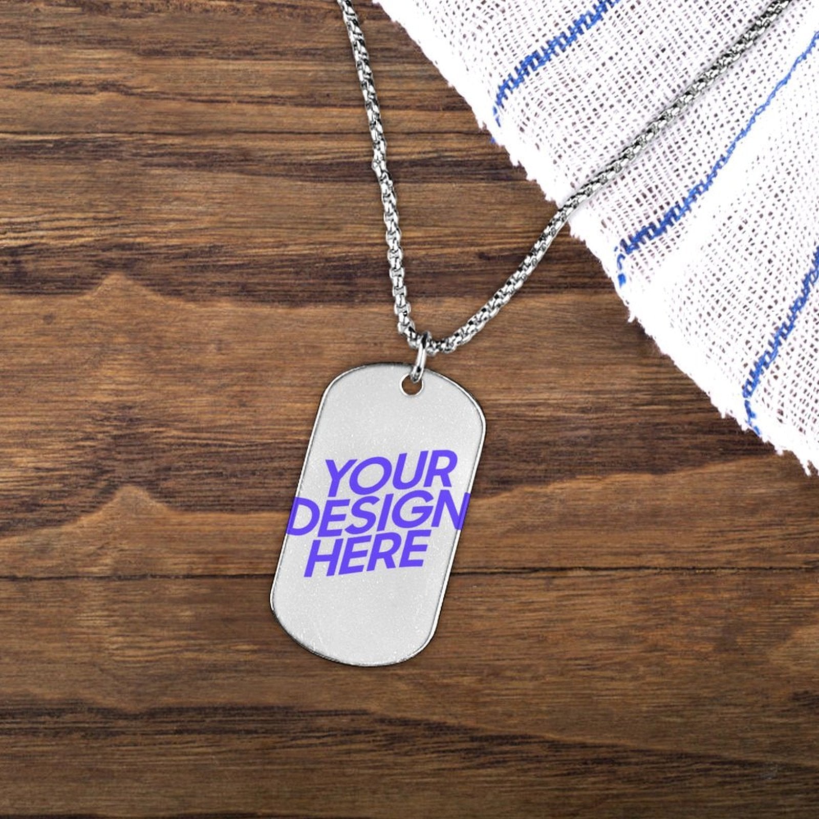 Étiquette : 4,5 cm de haut x 2,5 cm de large; Chaîne : 60 cm