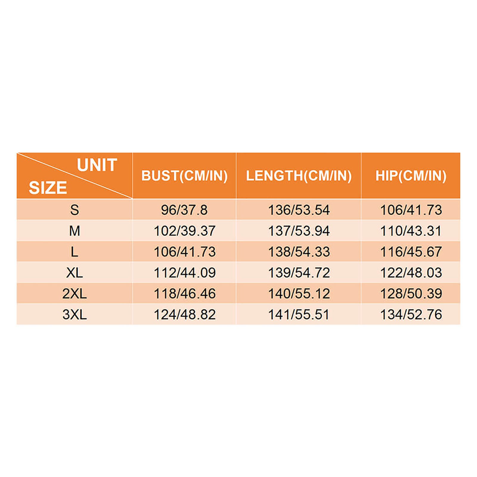 | Taille | Tour de poitrine (cm) | Longueur (cm) | Tour de hanches (cm) |