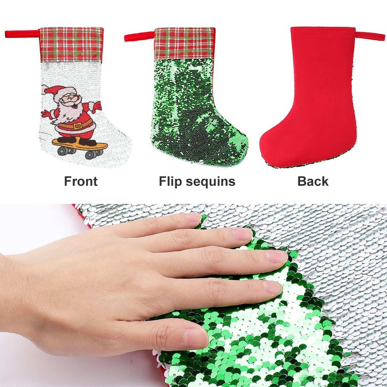 La surface de cette chaussette est recouverte de milliers de paillettes réversibles. D'un côté, elles forment une toile blanche parfaite pour accueillir votre photo ou votre design personnalisé, imprimé avec une clarté remarquable. De l'autre, elles dévoilent une couleur de Noël traditionnelle – rouge ou verte. Le passage de l'un à l'autre est un spectacle fascinant, une invitation à toucher, jouer et s'émerveiller.
